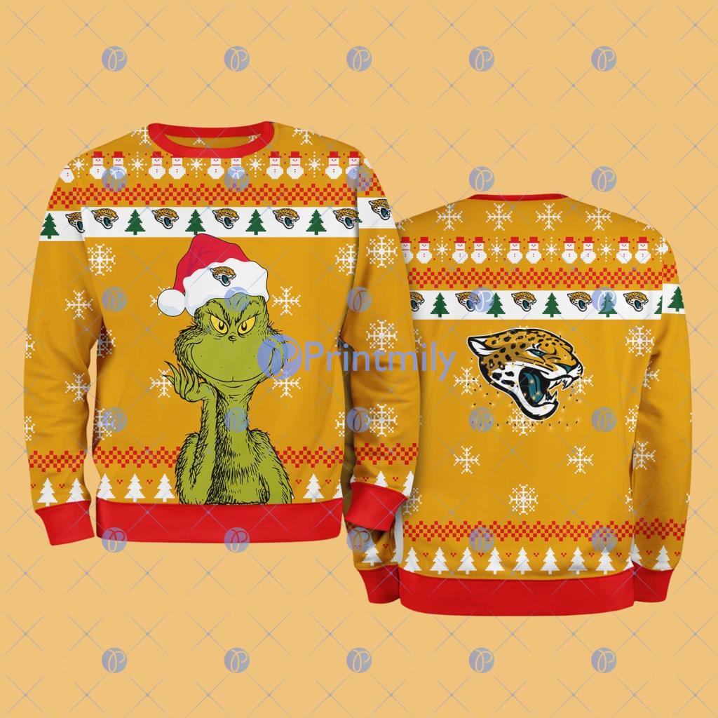 Embrace the holiday season with this unique Jacksonville Jaguars NFL The Grinch Funny Merry Christmas Ugly Sweater! This 3D sweater is the perfect new idea for any dedicated fan who wants to celebrate their team and the holidays with a touch of humor. A must-have addition to your Christmas wardrobe, this sweater is sure to turn heads at holiday parties, game day gatherings, or any festive occasion. Show off your team spirit and spread some holiday cheer with this eye-catching piece. Ideal for NFL fans, holiday sweaters enthusiasts, and anyone looking for a fun and unique Christmas gift.